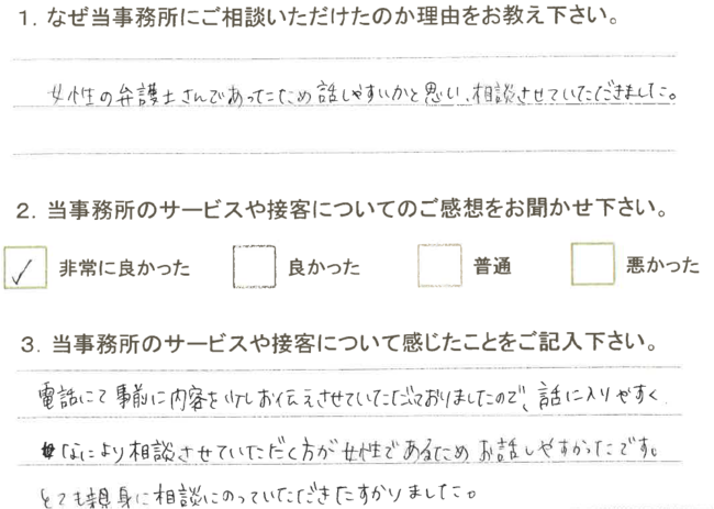 電話にて事前に内容を少しお伝えさせていただいておりましたので、話に入りやすく、なにより相談させていただく方が女性であるため、お話しやすかったです。 とても親身に相談にのっていただきたすかりました。